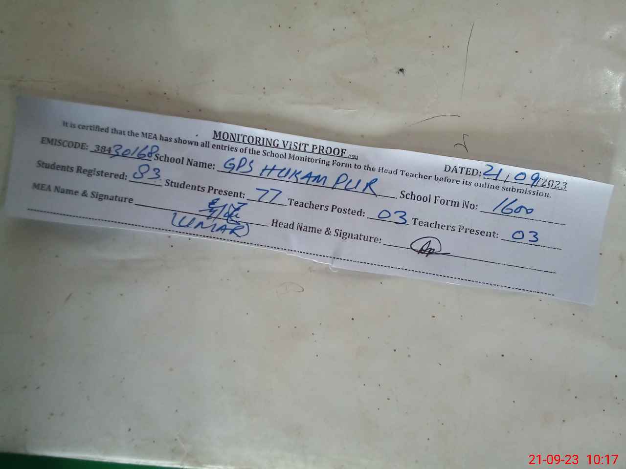 | EMIS Code: 38430168 | Name of School: GPS HUKAM PUR | |||