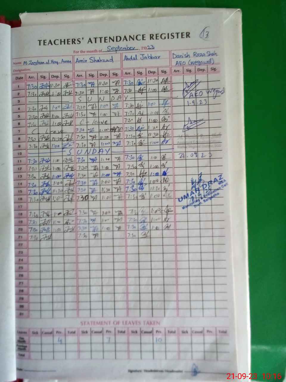 | CNIC | Full Name | Designation | R/C | Absence during last cal. month |