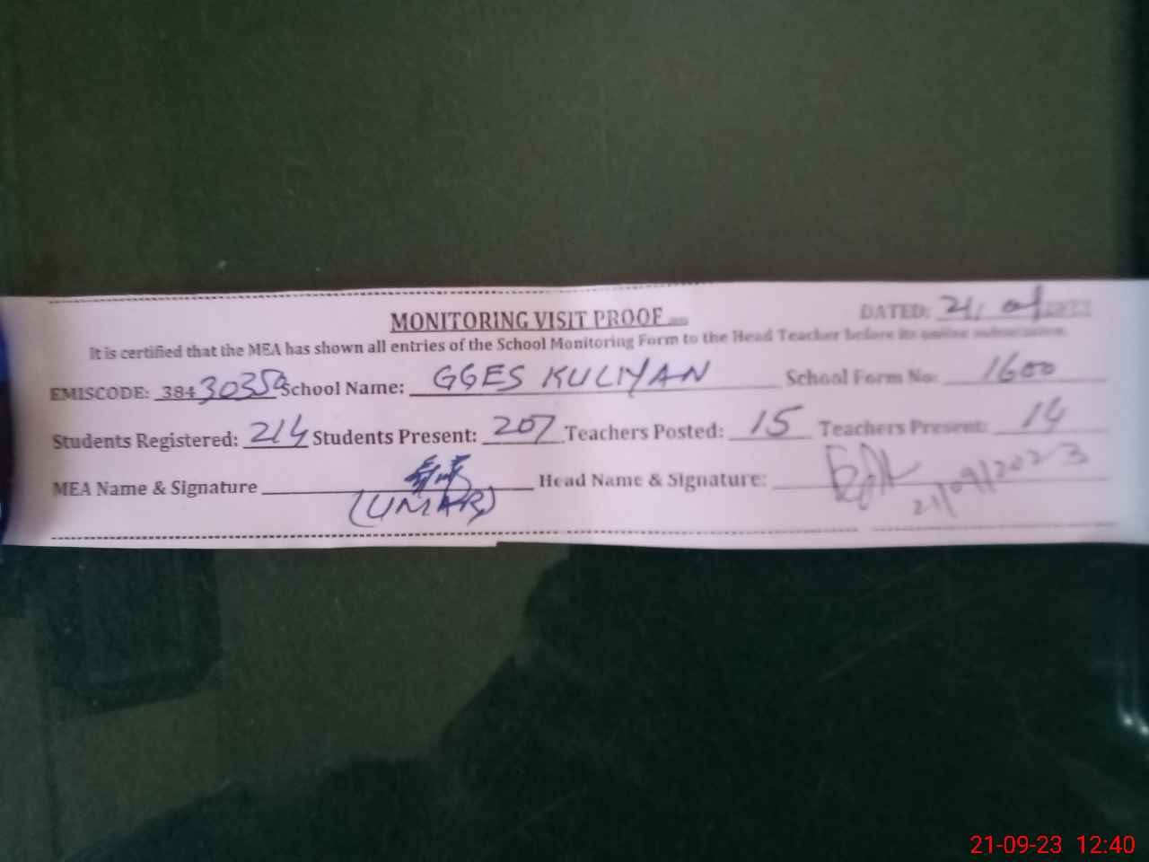 | Attendance Register | Head Teacher | MEA with School | Visit Proof |