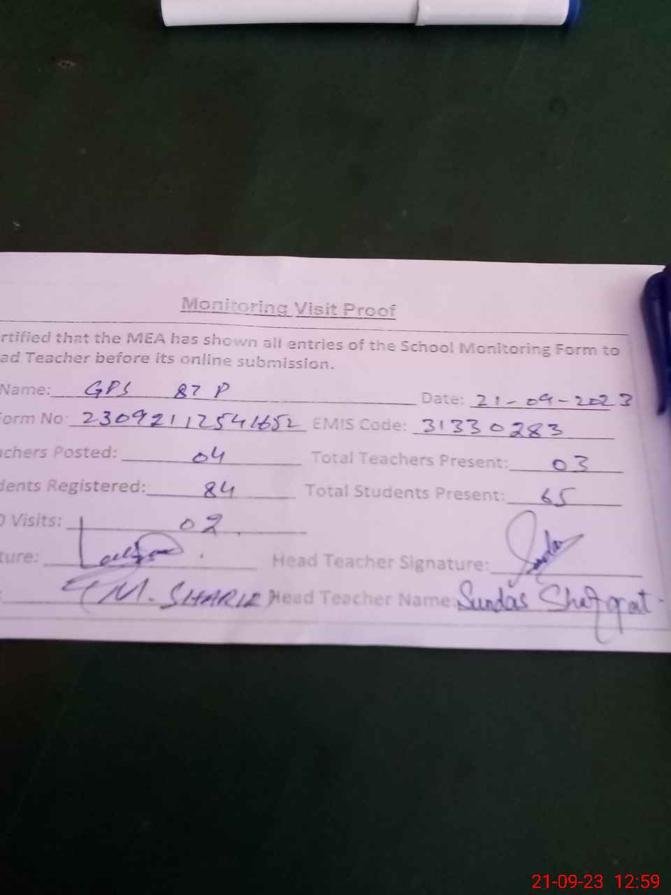 | Attendance Register | Head Teacher | MEA with School | Visit Proof |