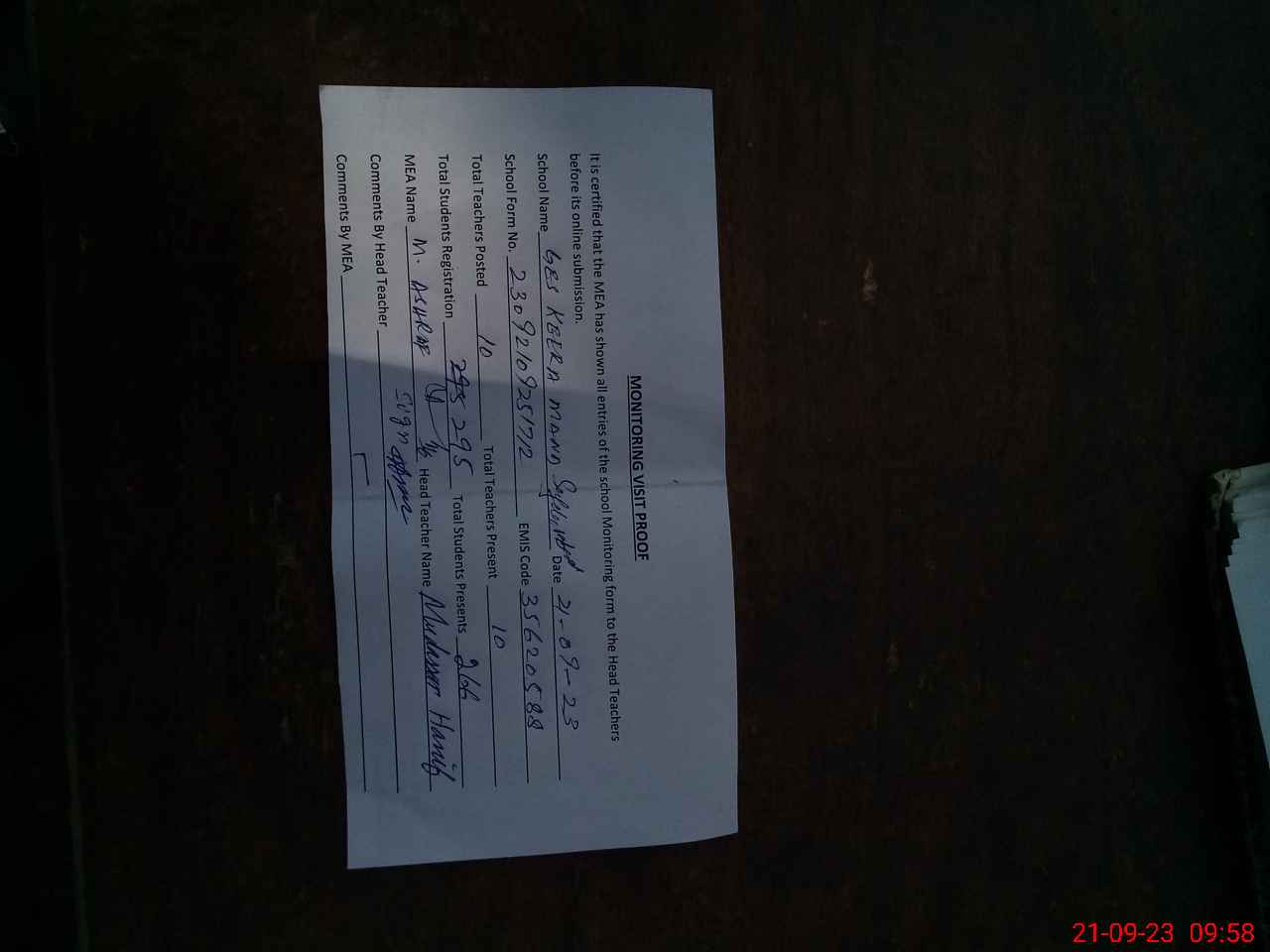| Attendance Register | Head Teacher | MEA with School | Visit Proof |