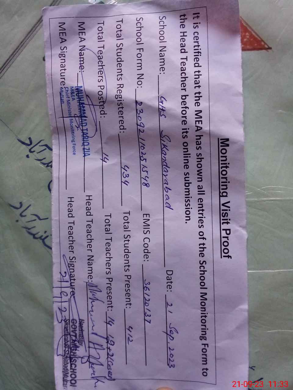 | Attendance Register | Head Teacher | MEA with School | Visit Proof |