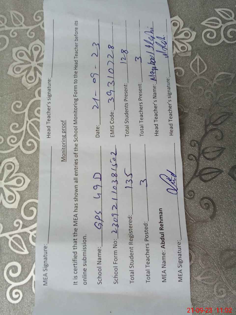 | Attendance Register | Head Teacher | MEA with School | Visit Proof |