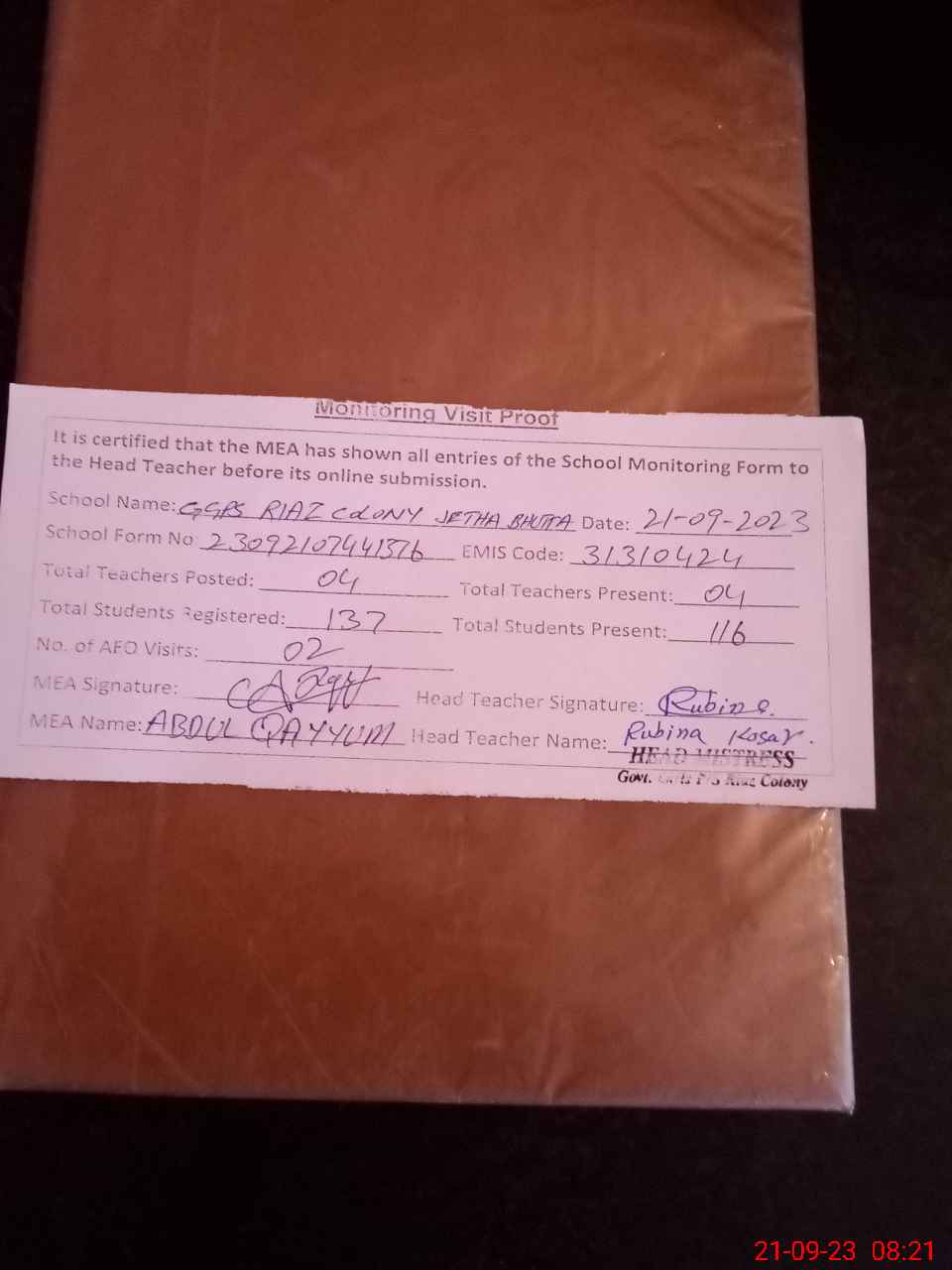 | EMIS Code: 31310424 | Name of School: GGPS RIAZ COLONY JETHA BHUTTA (After Noon) | |||