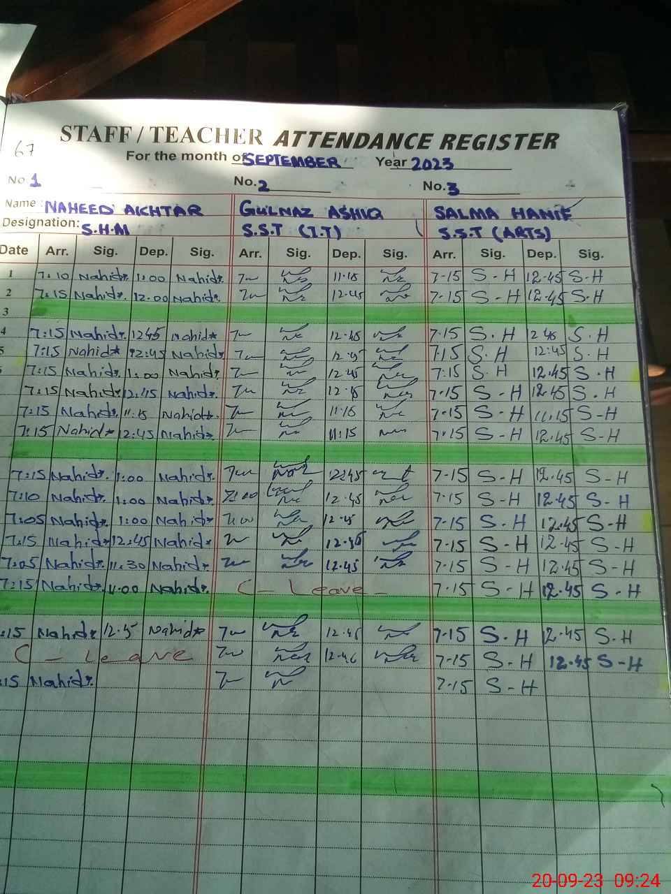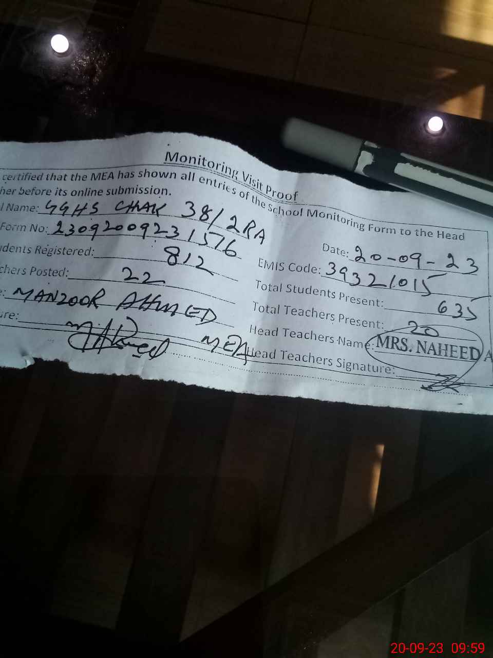 | Monitoring Date: 20-09-2023 | Start Time: 20-09-2023 09:23 AM | End Time: 20-09-2023 10:00 AM | Name of MEA: MA**** AH**** | |
