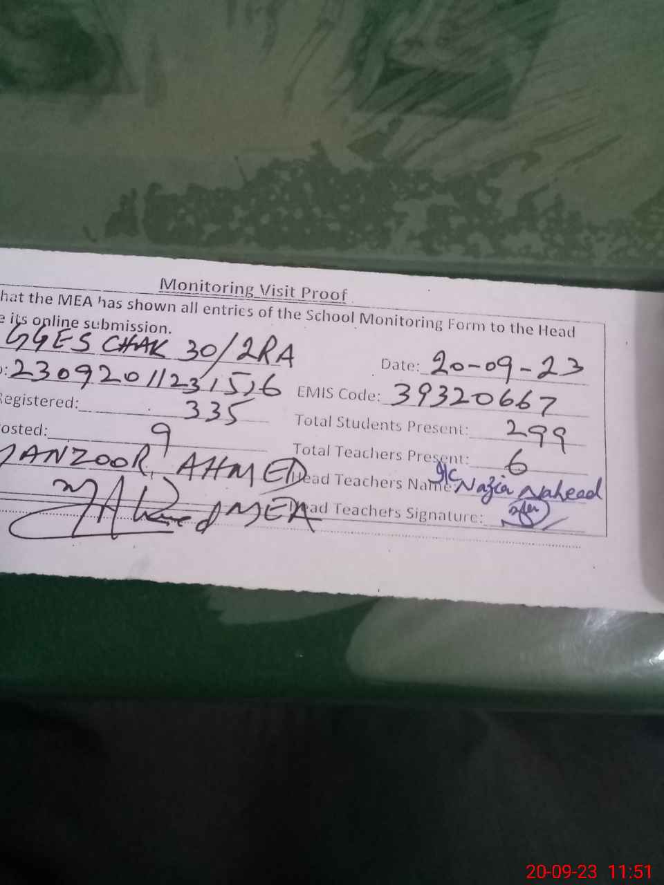| Attendance Register | Head Teacher | MEA with School | Visit Proof |