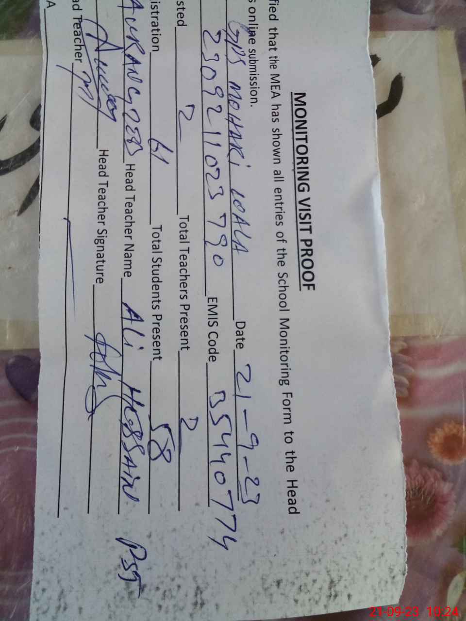 | Attendance Register | Head Teacher | MEA with School | Visit Proof |