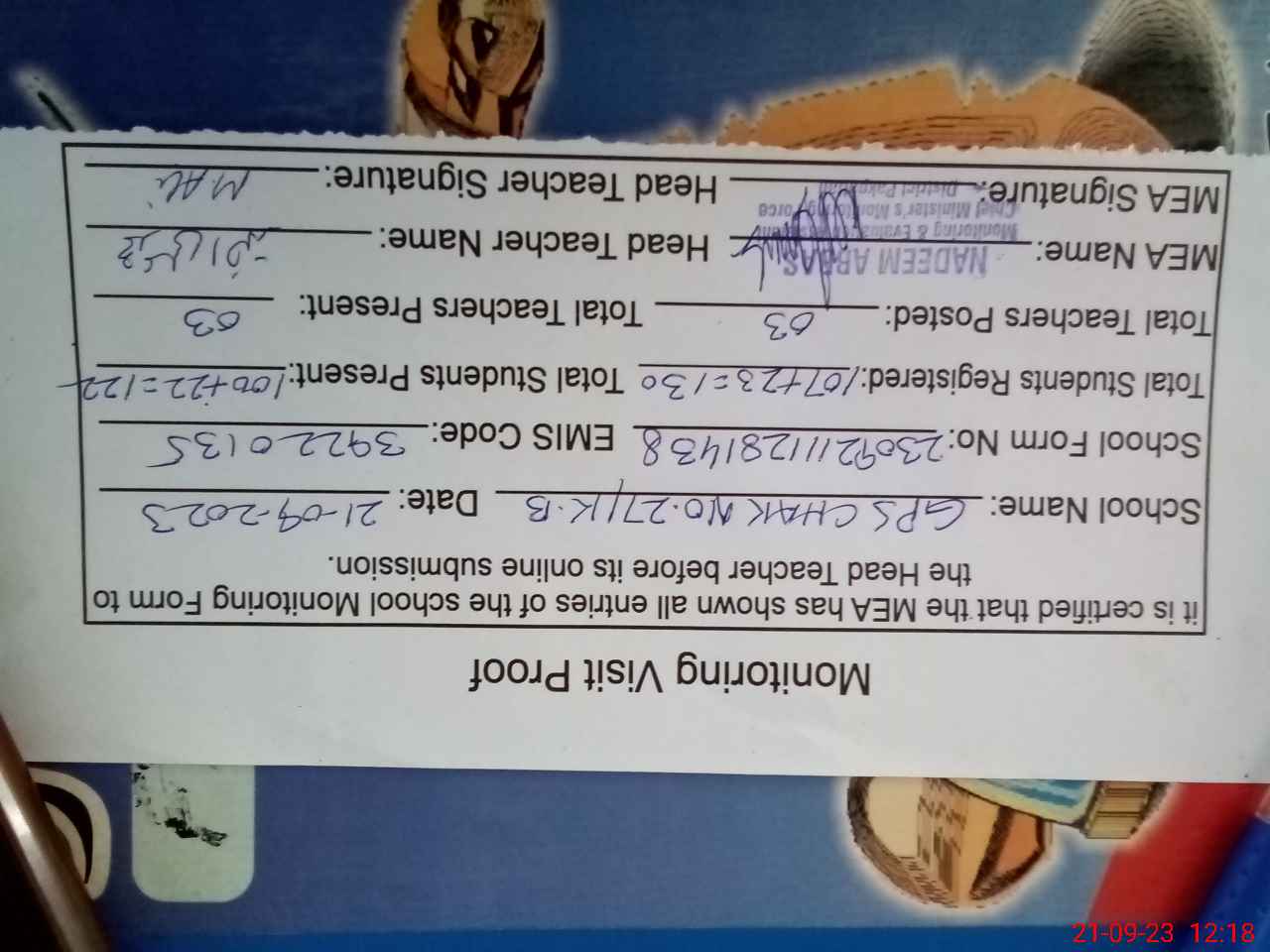 | Attendance Register | Head Teacher | MEA with School | Visit Proof |