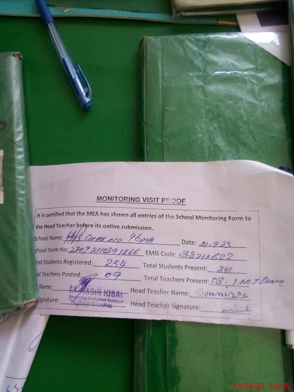 | Attendance Register | Head Teacher | MEA with School | Visit Proof |