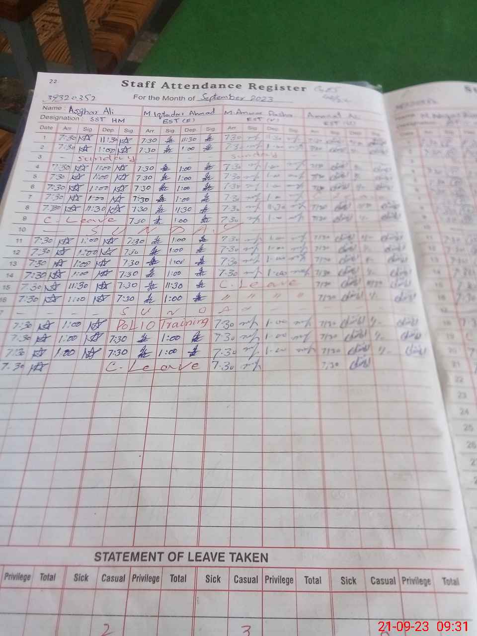 | Monitoring Date: 21-09-2023 | Start Time: 21-09-2023 09:31 AM | End Time: 21-09-2023 10:13 AM | Name of MEA: SH**** AL**** ZI**** (R**** | |