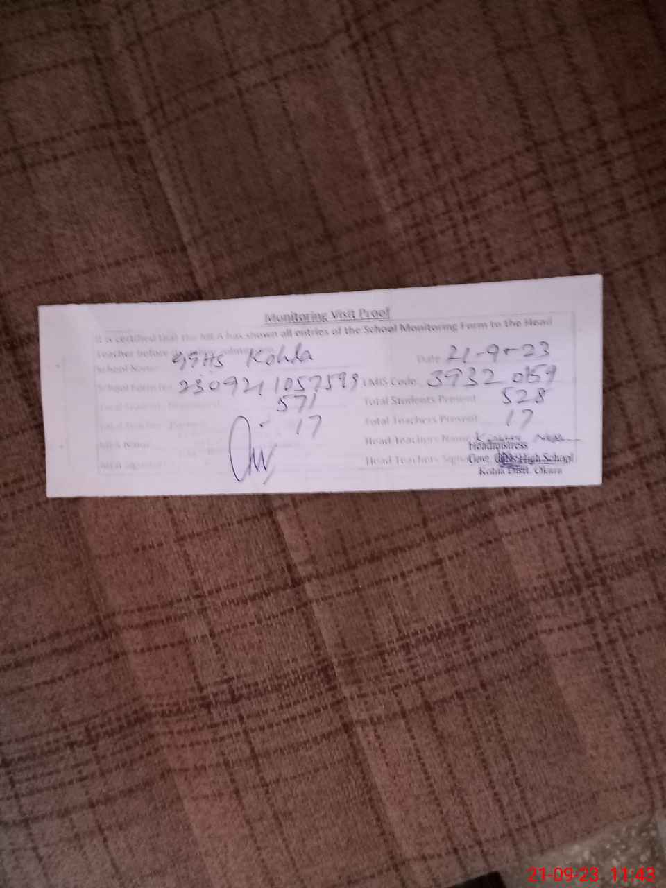 | Name: KI**** NA**** Designation: (School Headmaster's/Headmistress's) S.S.T.(Science) Phone/Cell Number: 03**** |
