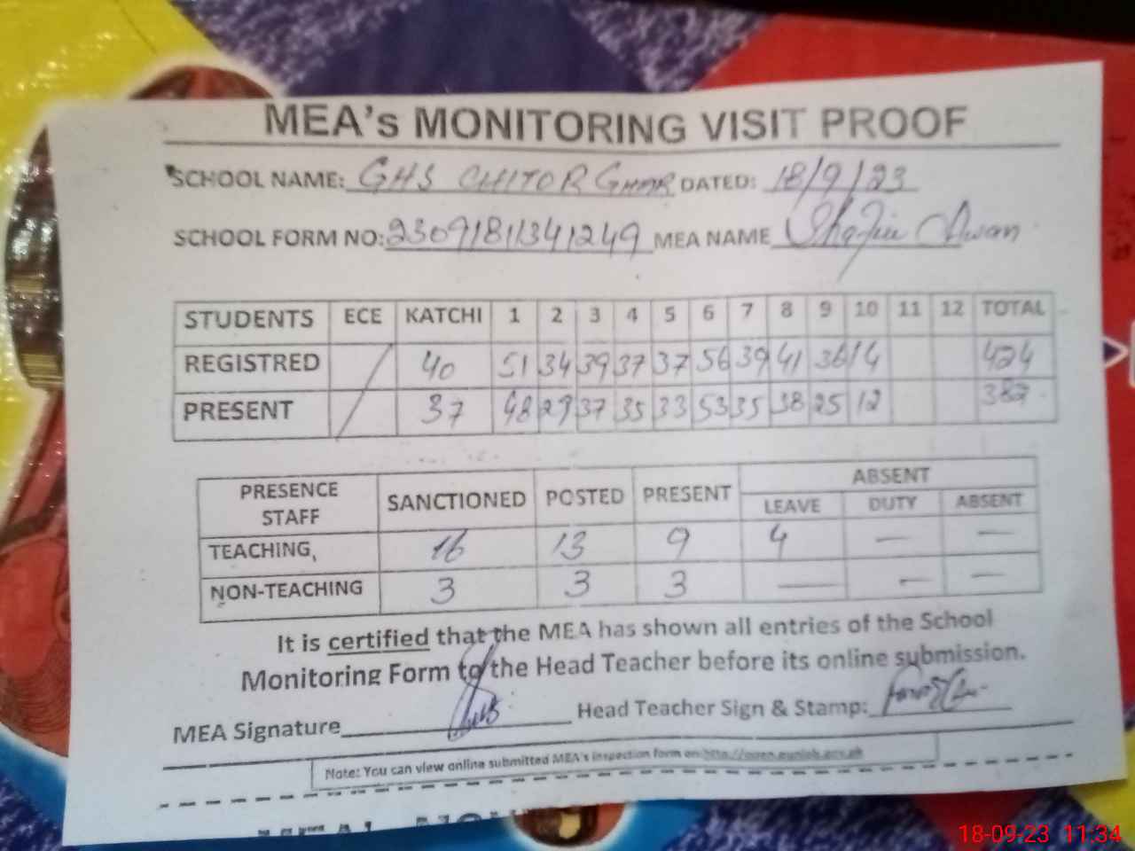 | Attendance Register | Head Teacher | MEA with School | Visit Proof |