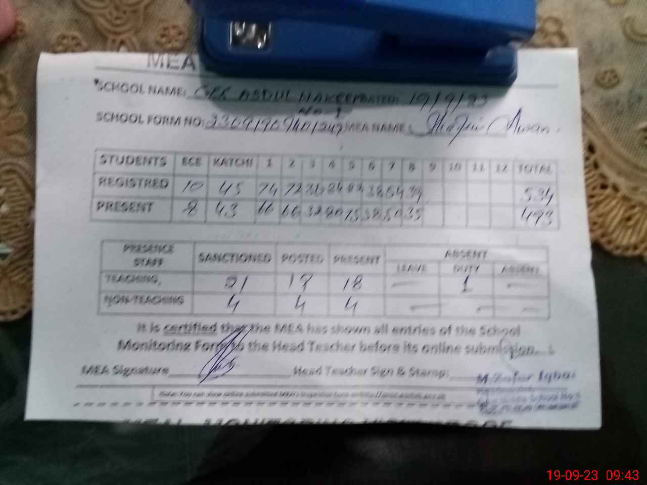 | Attendance Register | Head Teacher | MEA with School | Visit Proof |