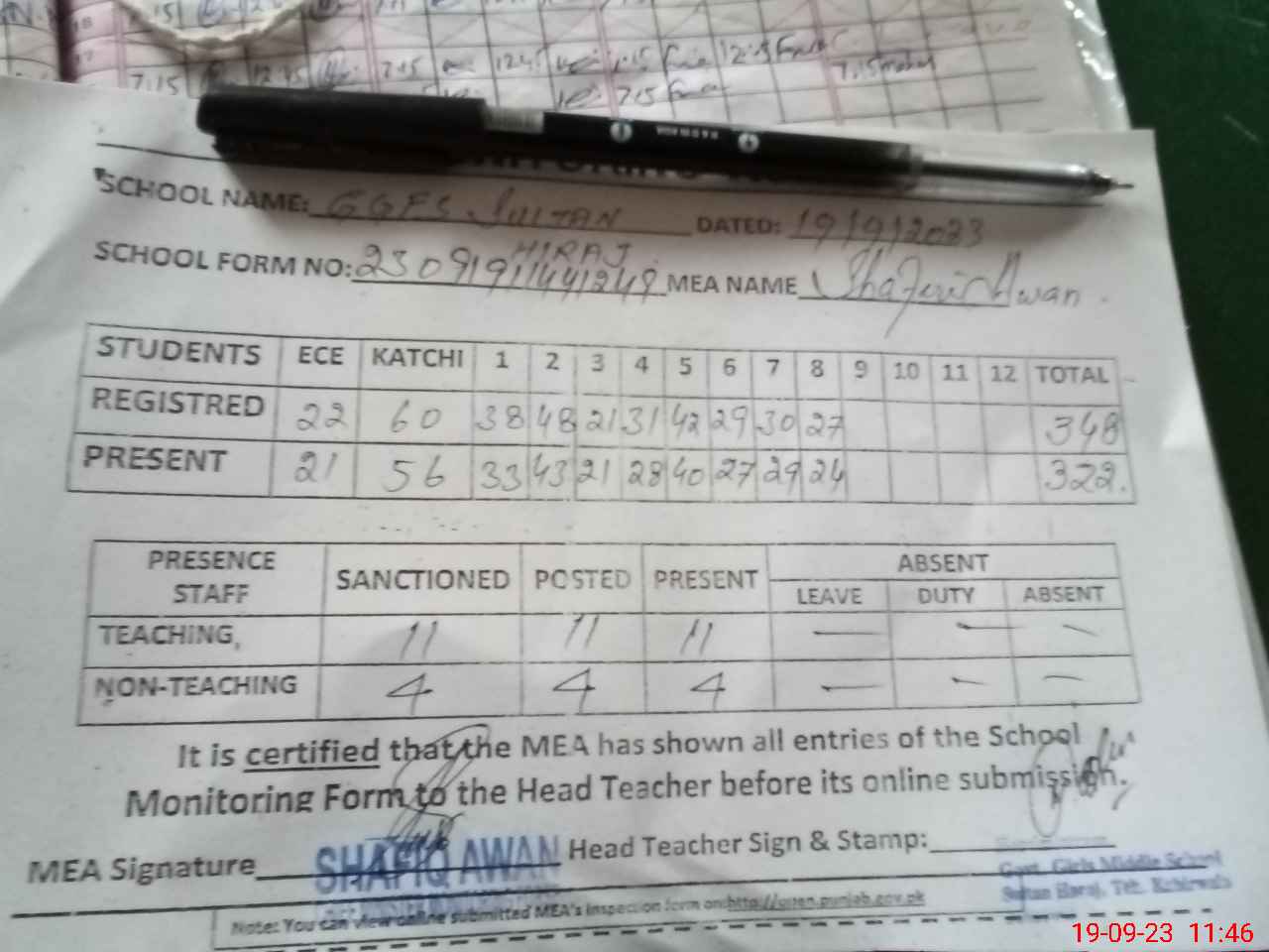 | Certified that this School was Inspected by the Undersigned MEA/DMO Today and the Information Stated Above is as Per Record. | |||||
