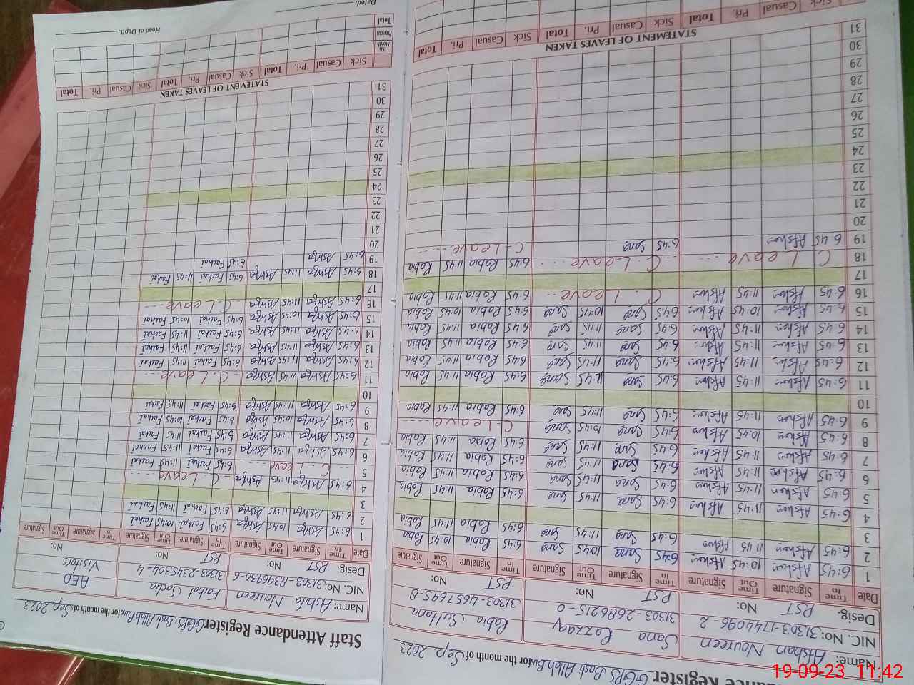 | CNIC | Full Name | Designation | R/C | Absence during last cal. month |