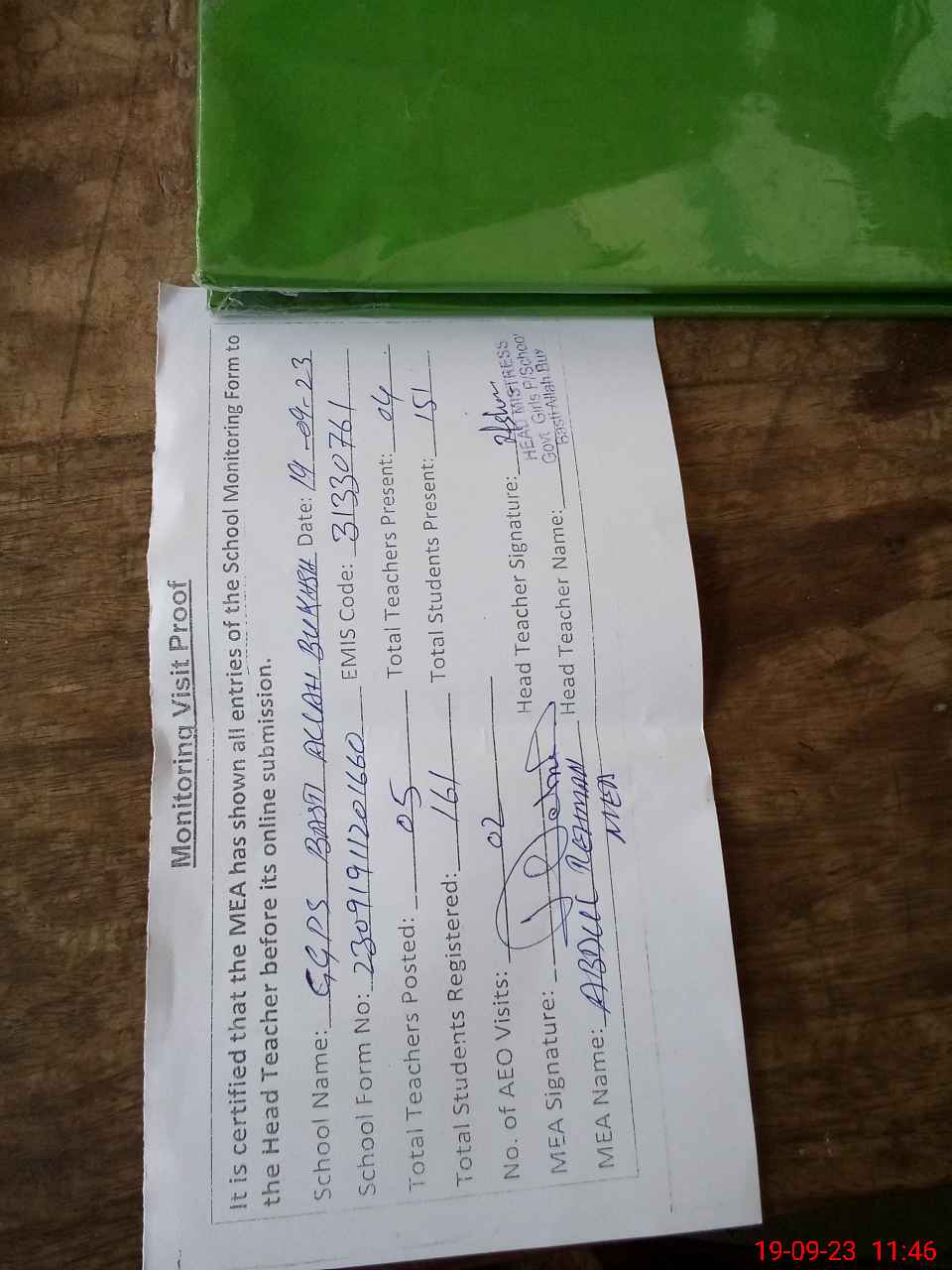 | Attendance Register | Head Teacher | MEA with School | Visit Proof |