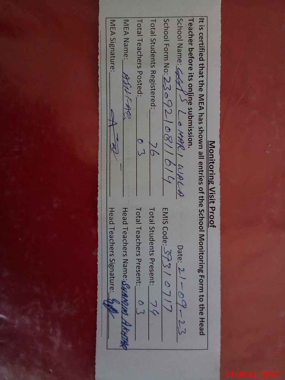 | Attendance Register | Head Teacher | MEA with School | Visit Proof |