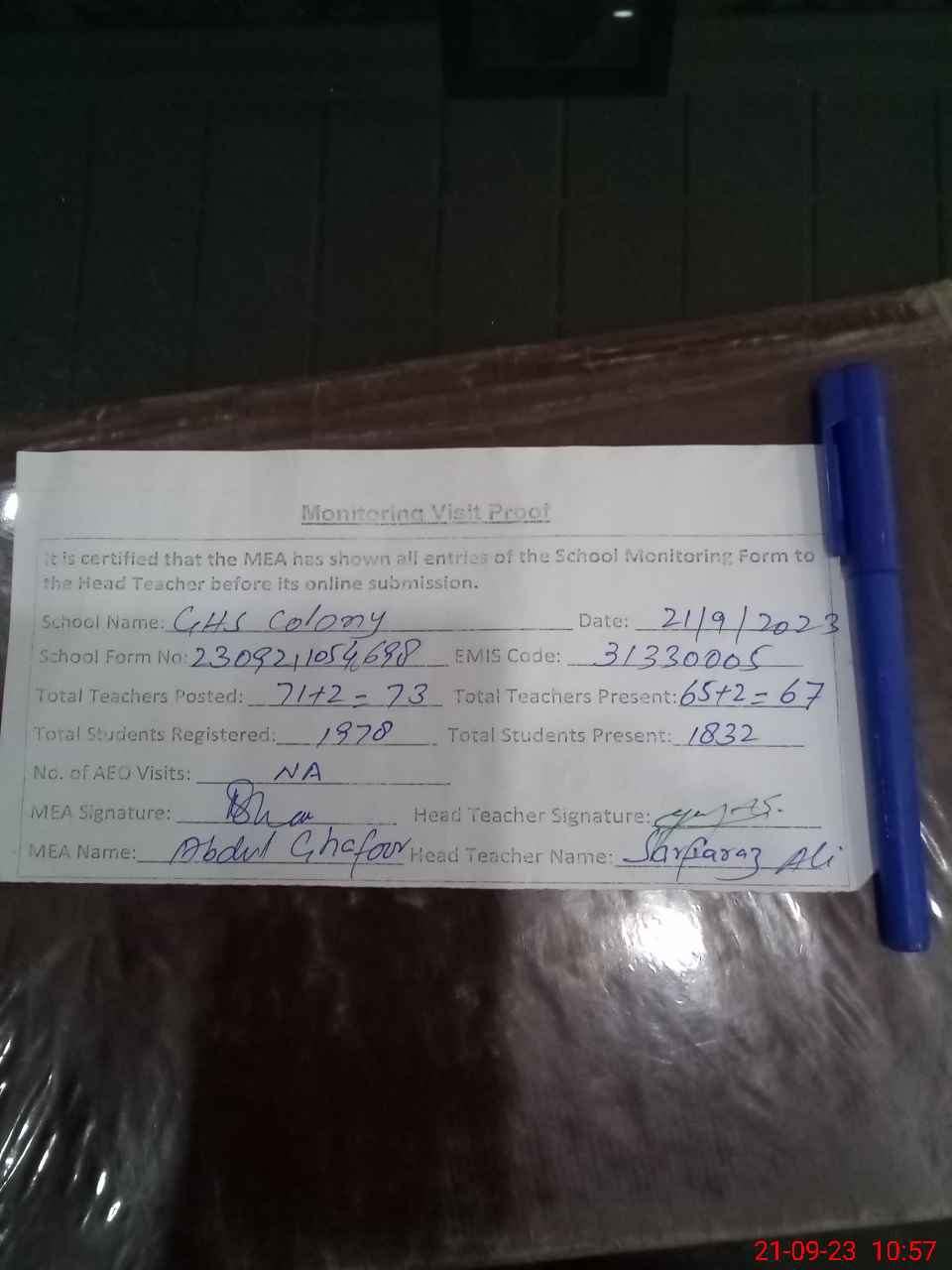 | Attendance Register | Head Teacher | MEA with School | Visit Proof |