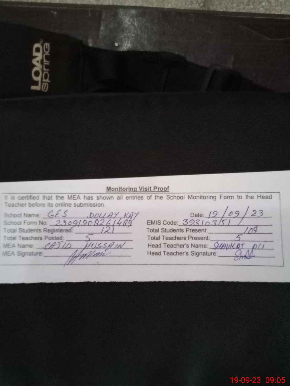 | Attendance Register | Head Teacher | MEA with School | Visit Proof |