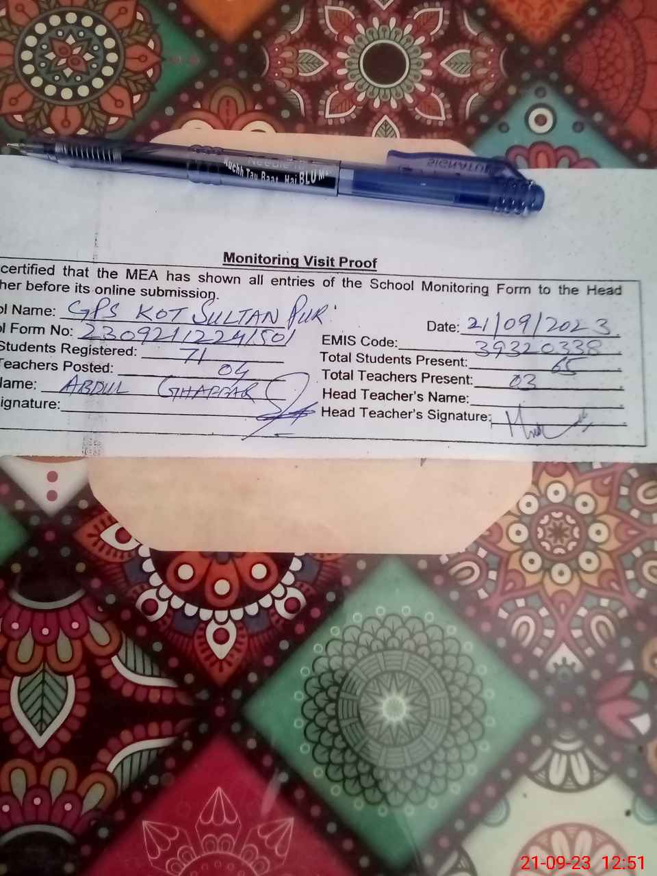 | EMIS Code: 39320338 | Name of School: GPS KOT SULTAN PUR | |||