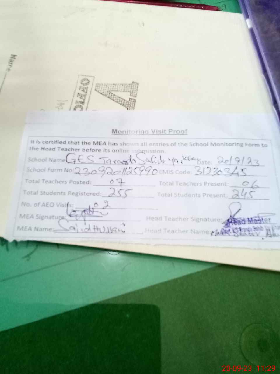 | Attendance Register | Head Teacher | MEA with School | Visit Proof |