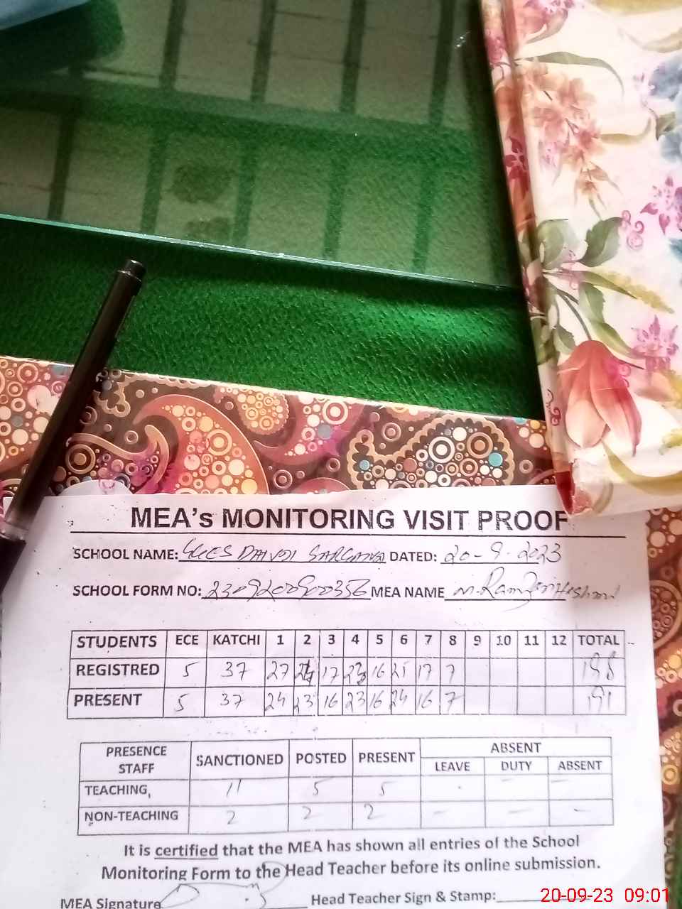 | Attendance Register | Head Teacher | MEA with School | Visit Proof |