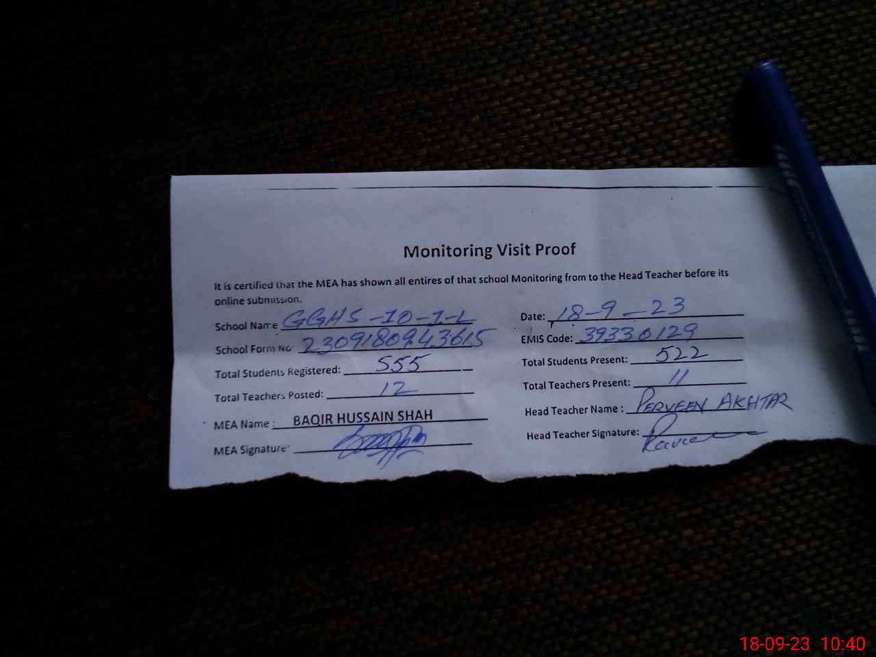 | Attendance Register | Head Teacher | MEA with School | Visit Proof |
