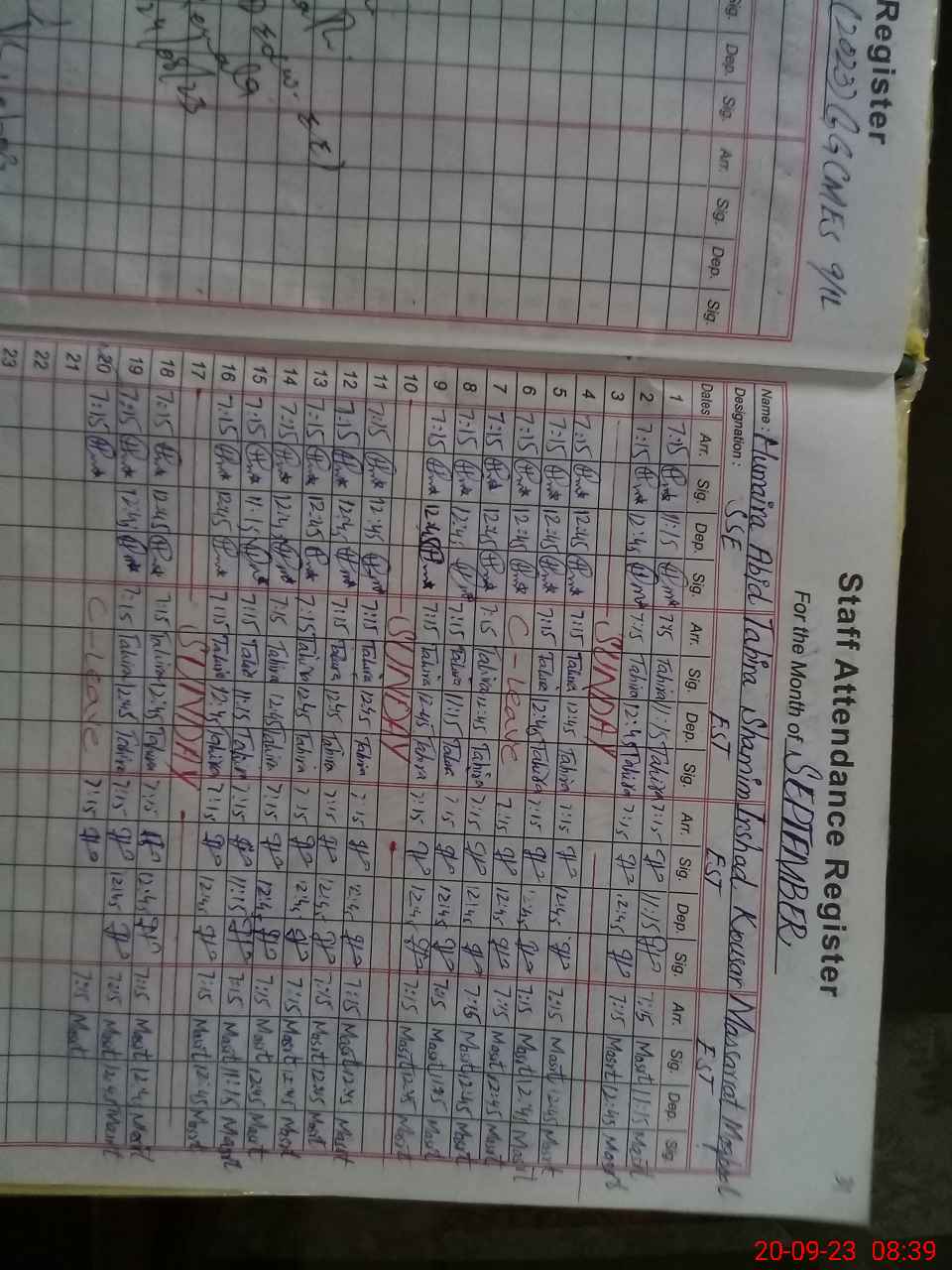 | Monitoring Date: 20-09-2023 | Start Time: 20-09-2023 08:39 AM | End Time: 20-09-2023 09:13 AM | Name of MEA: BA**** HU**** SH**** | |