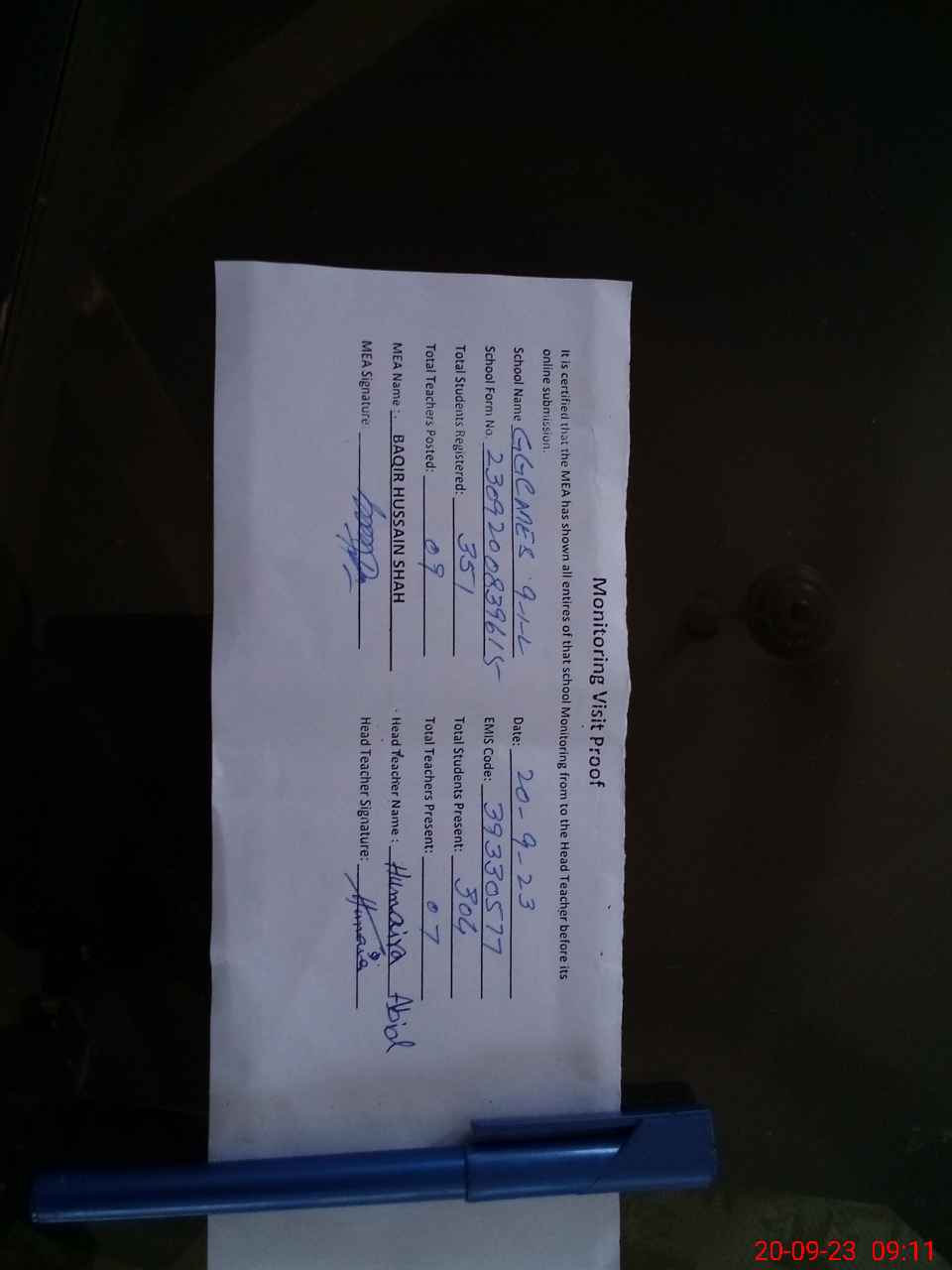 | Attendance Register | Head Teacher | MEA with School | Visit Proof |