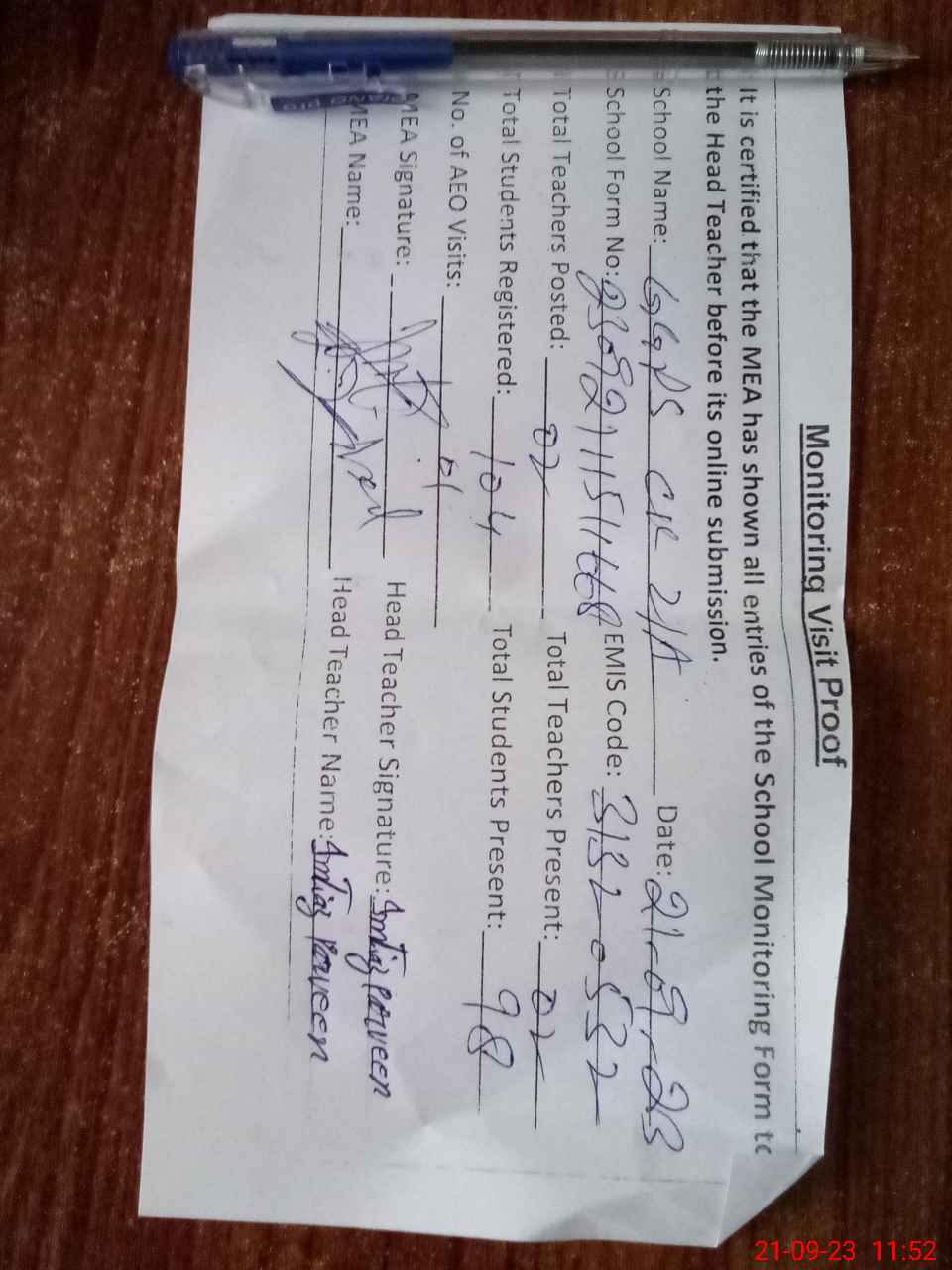 | Attendance Register | Head Teacher | MEA with School | Visit Proof |