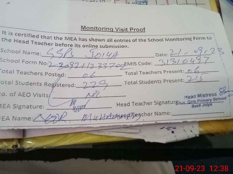 | Attendance Register | Head Teacher | MEA with School | Visit Proof |