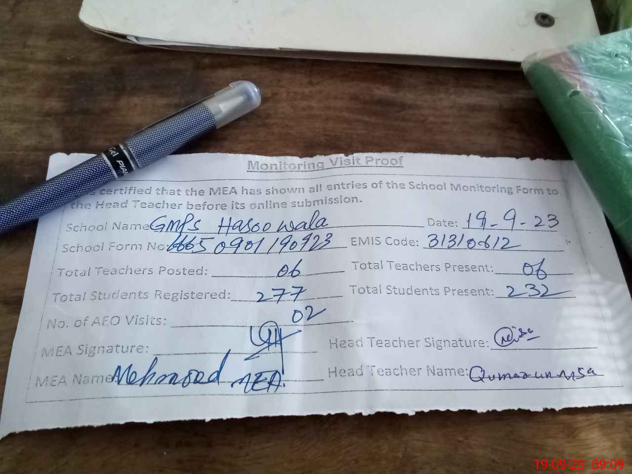 | EMIS Code: 31310612 | Name of School: GMPS HASOO WALA (After Noon) | |||