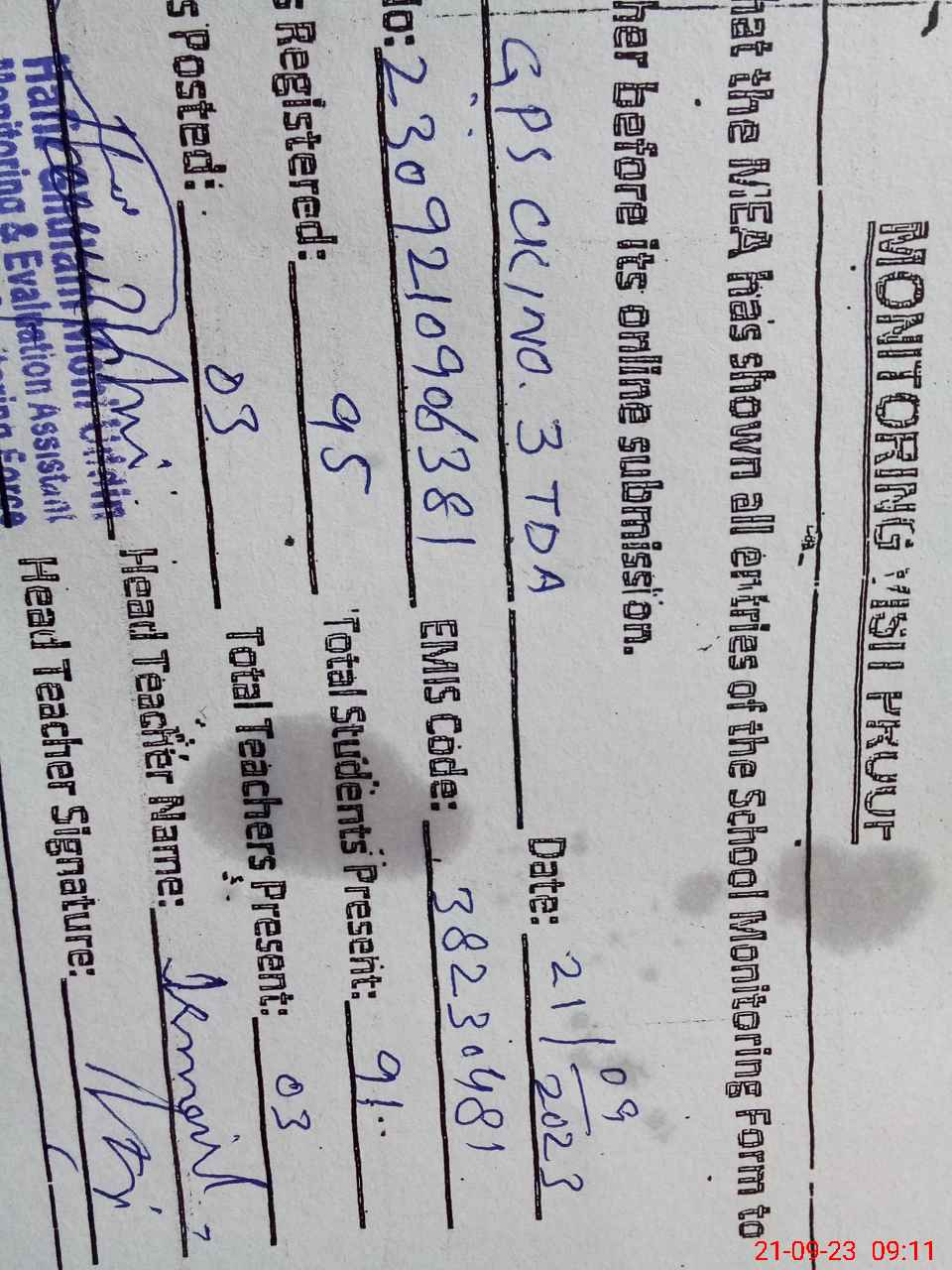 | Monitoring Date: 21-09-2023 | Start Time: 21-09-2023 08:50 AM | End Time: 21-09-2023 09:21 AM | Name of MEA: HA**** GH**** MO**** UDDI**** | |