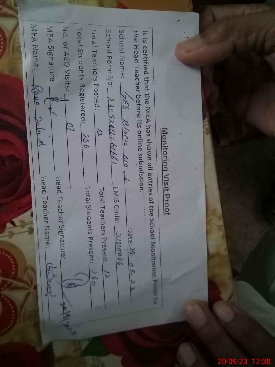| Attendance Register | Head Teacher | MEA with School | Visit Proof |