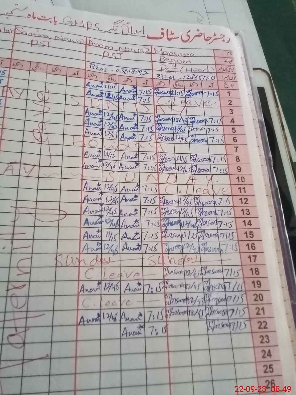 | Name: Sh**** Pe**** Designation: (School Headmaster's/Headmistress's) PST/ Phone/Cell Number: 04**** |