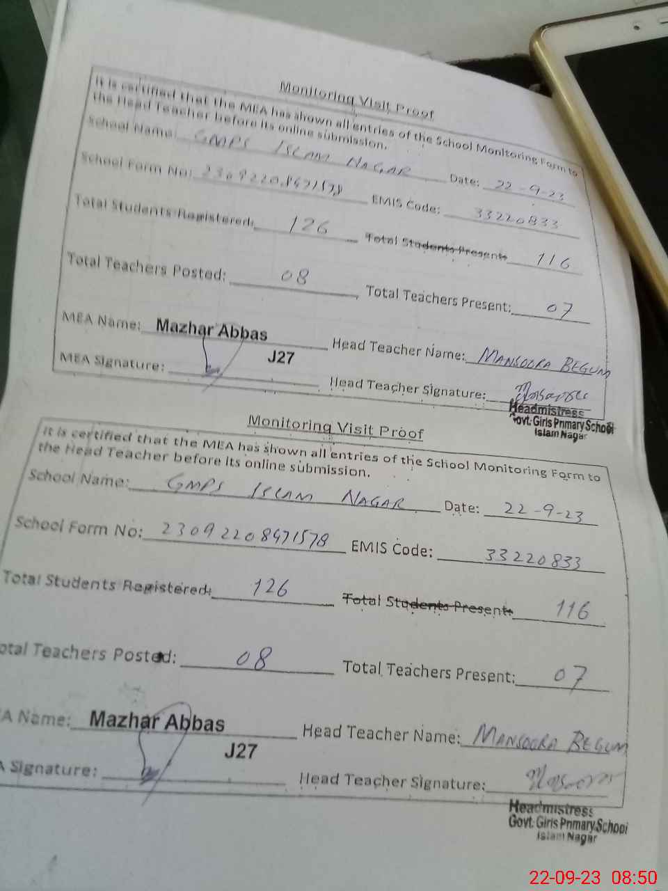 | Attendance Register | Head Teacher | MEA with School | Visit Proof |