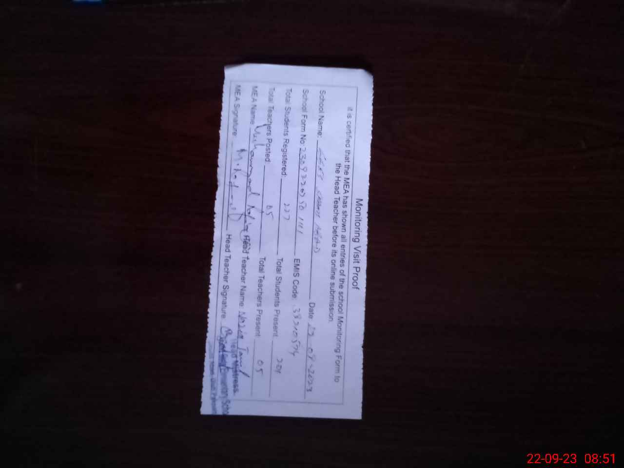 | Attendance Register | Head Teacher | MEA with School | Visit Proof |