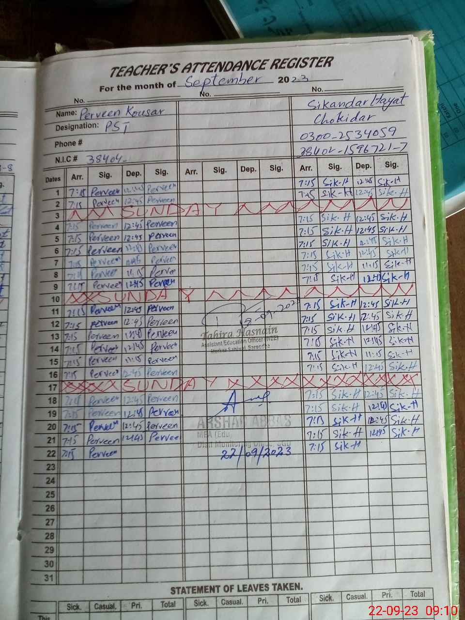 | Name: SA**** KA**** Designation: (School Headmaster's/Headmistress's) PST Phone/Cell Number: 03**** |