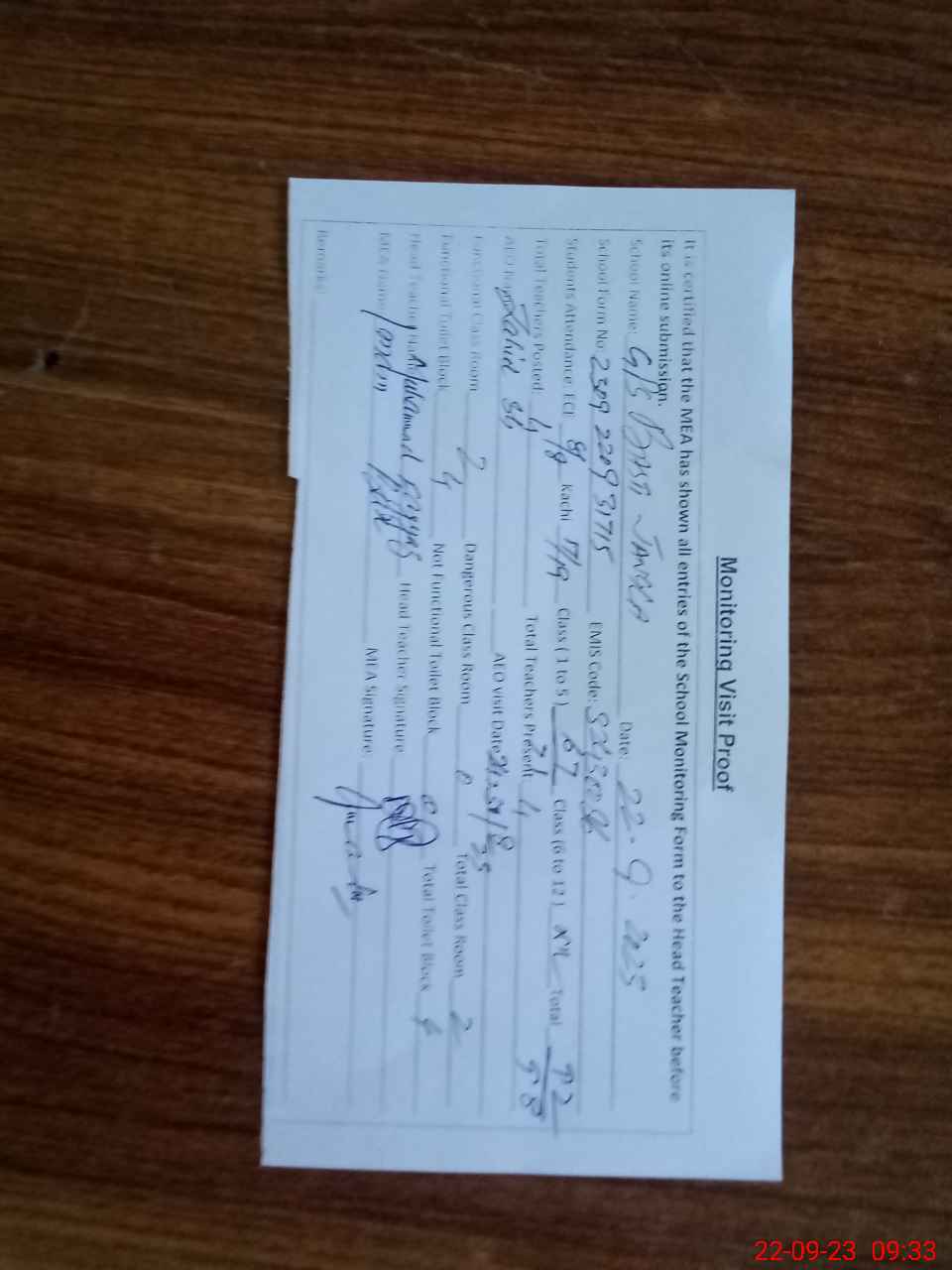 | Attendance Register | Head Teacher | MEA with School | Visit Proof |