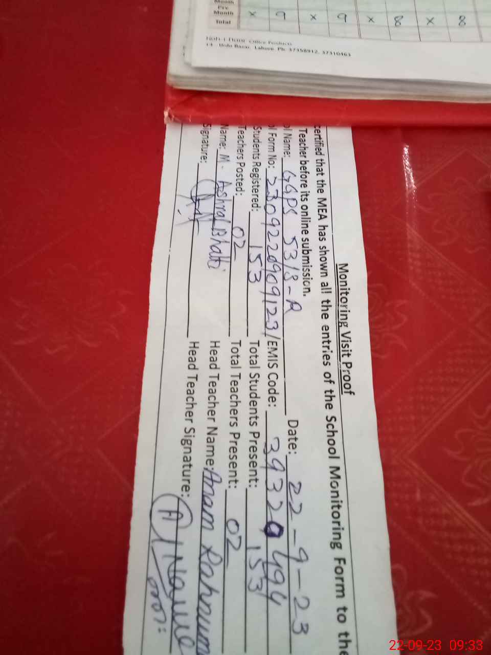 | Attendance Register | Head Teacher | MEA with School | Visit Proof |