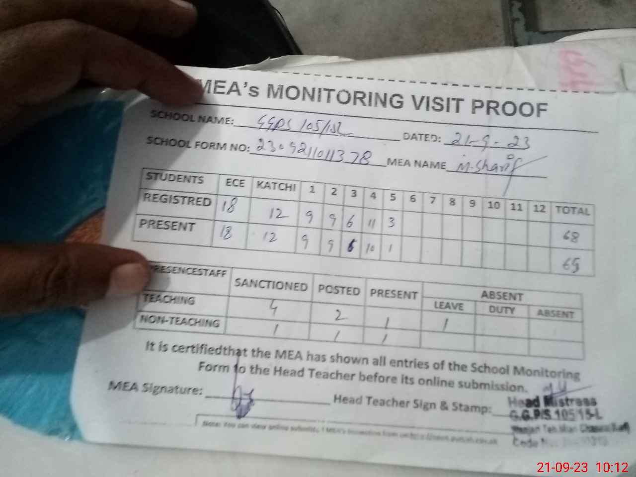 | Attendance Register | Head Teacher | MEA with School | Visit Proof |