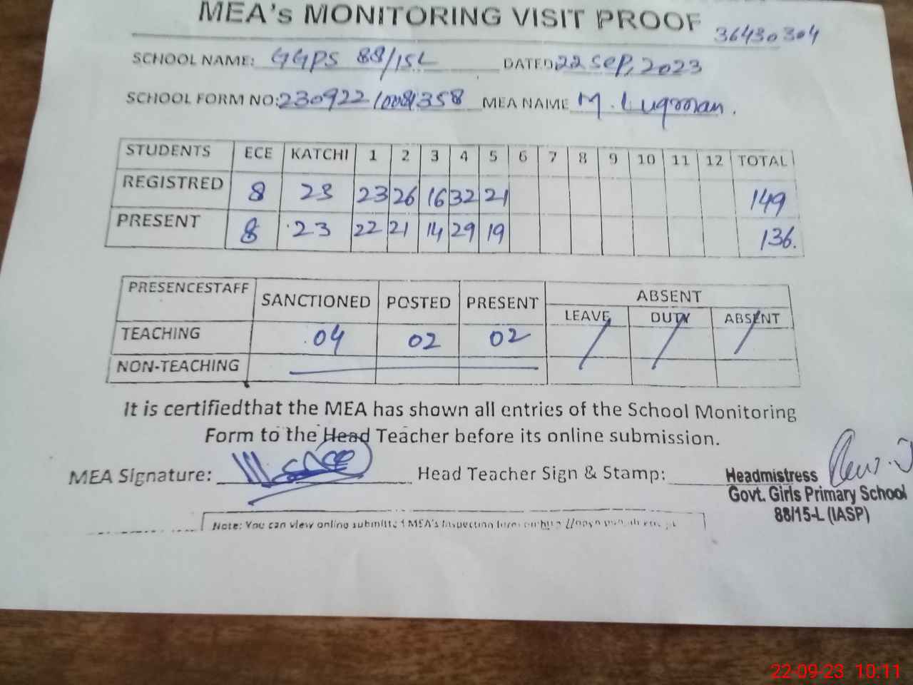 | Attendance Register | Head Teacher | MEA with School | Visit Proof |