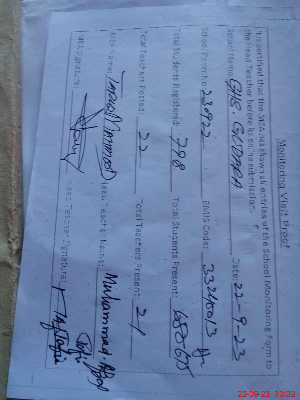 | Name: MAF**** JA**** Designation: (School Headmaster's/Headmistress's) HEADMASTER Phone/Cell Number: 03**** |