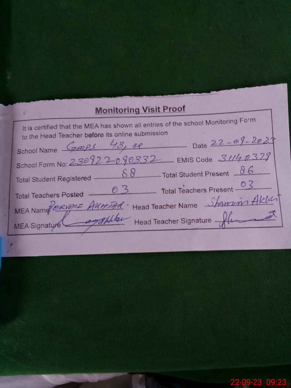 | Attendance Register | Head Teacher | MEA with School | Visit Proof |