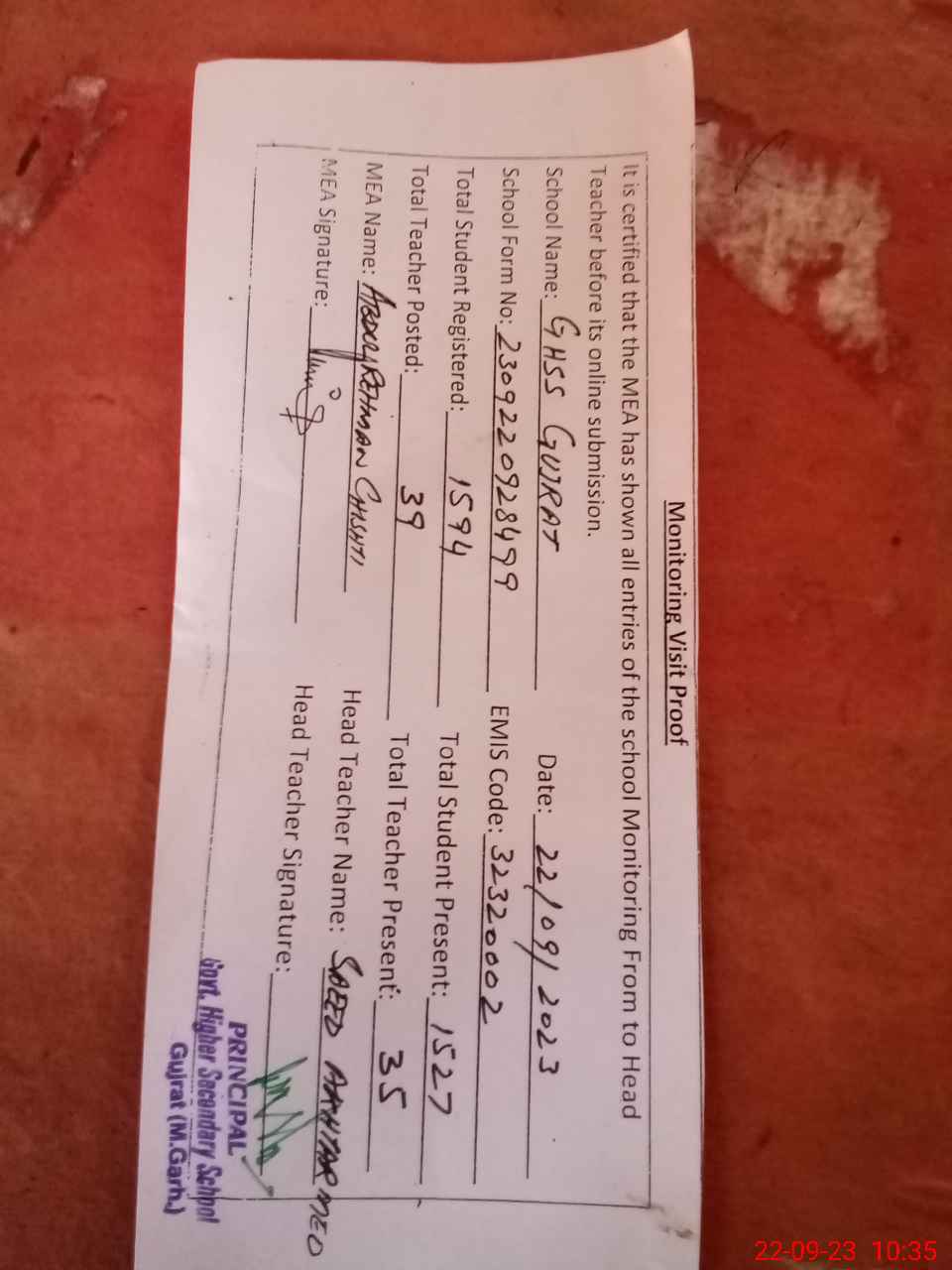| Attendance Register | Head Teacher | MEA with School | Visit Proof |