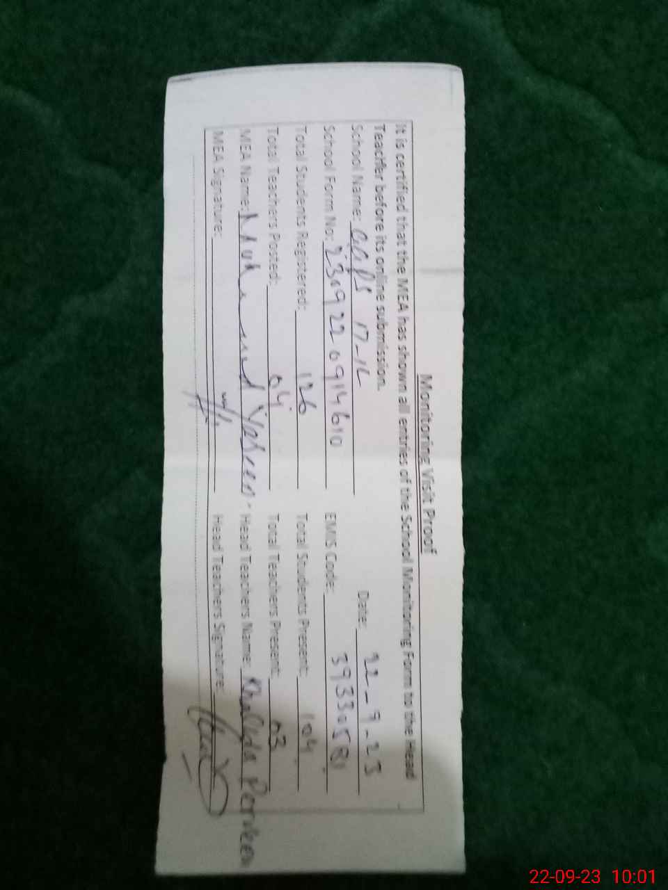 | Name: AM**** TA**** Designation: (School Headmaster's/Headmistress's) PST Phone/Cell Number: 03**** |