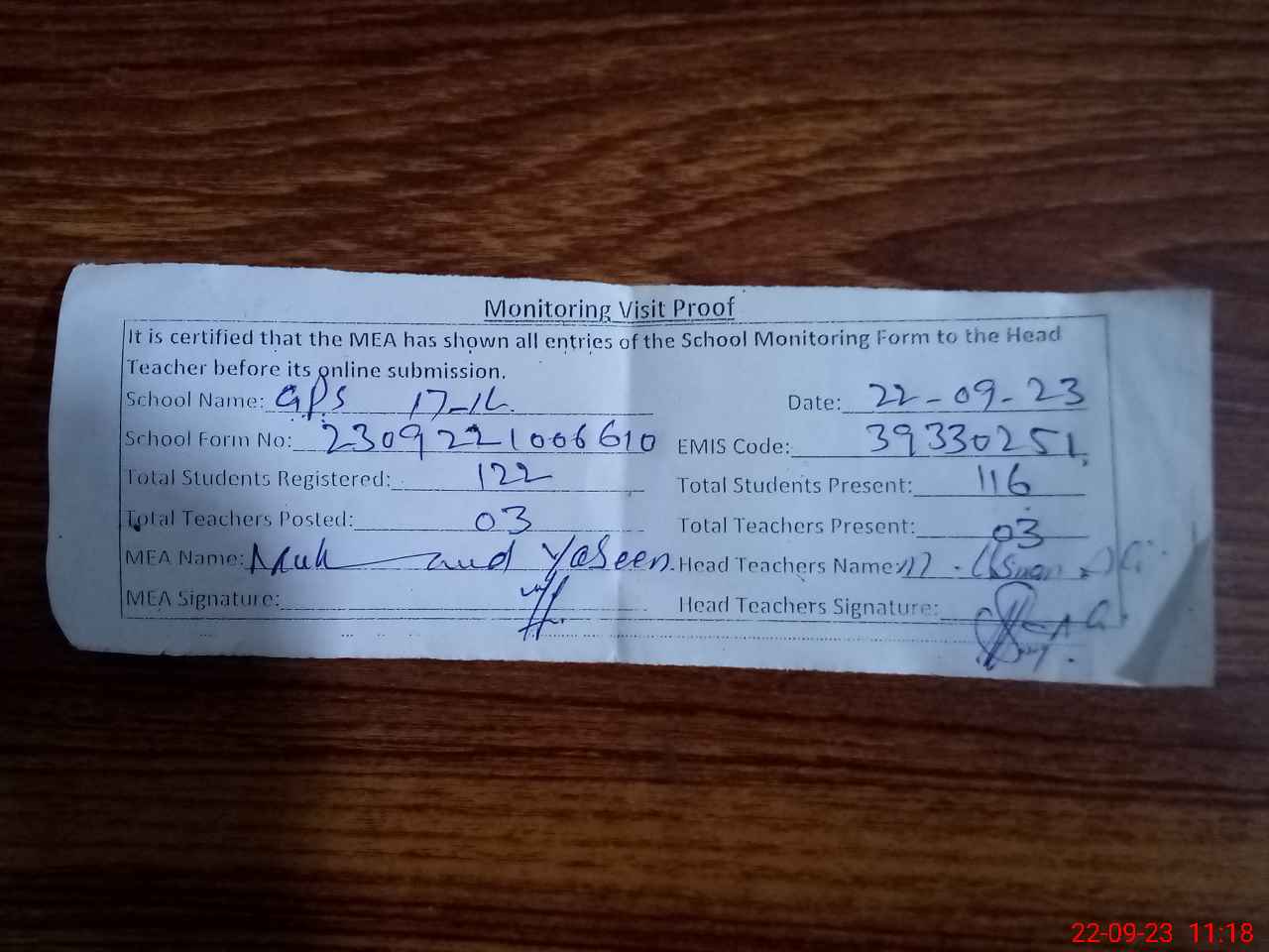 | Attendance Register | Head Teacher | MEA with School | Visit Proof |