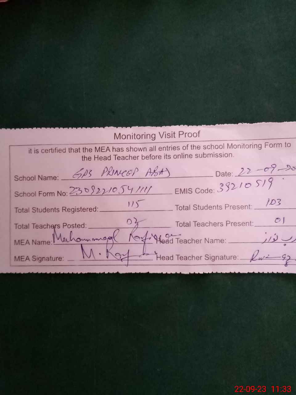 | Attendance Register | Head Teacher | MEA with School | Visit Proof |