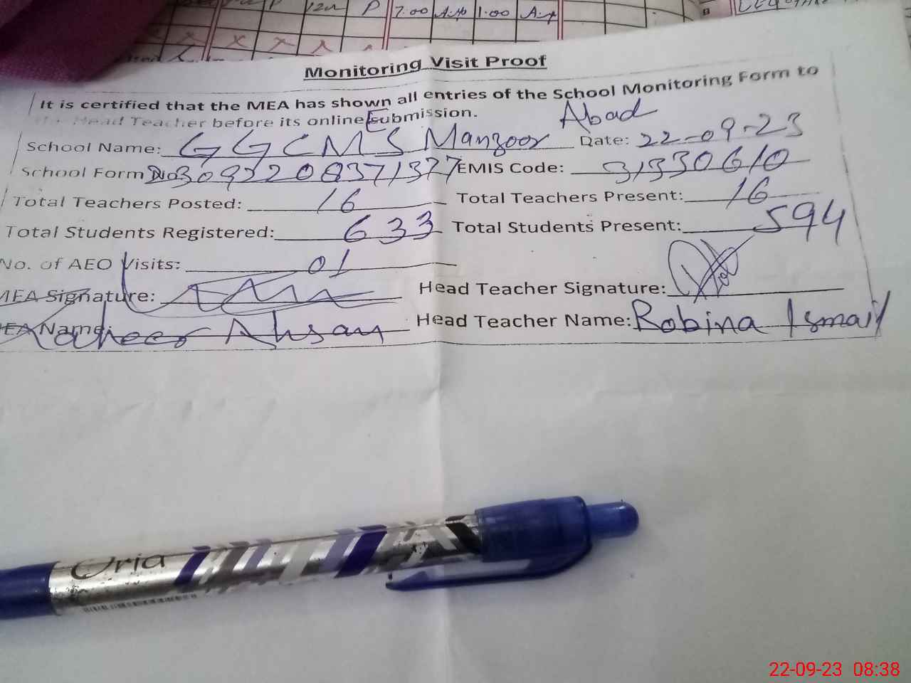 | Monitoring Date: 22-09-2023 | Start Time: 22-09-2023 07:45 AM | End Time: 22-09-2023 08:52 AM | Name of MEA: Za**** Ah**** | |
