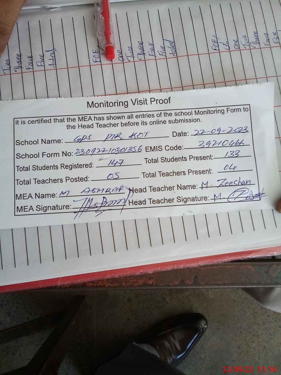 | Attendance Register | Head Teacher | MEA with School | Visit Proof |